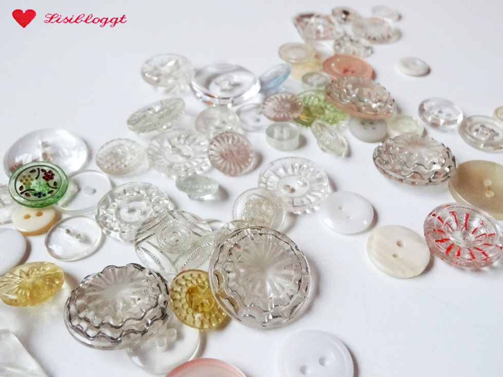 Kitschige Sachen wie Perlen, Kunstblüten oder Spitzenbesatz hebe ich natürlich ganz besonders gern auf (hieraus habe ich meinen schönen Einhorn-Haarreif gezaubert) und natürlich Knöpfe (mit denen man ganz wunderbare Knopf-Grußkarten basteln kann).