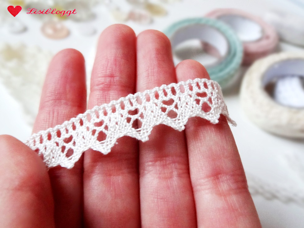Wenn Du keine alten Spitzenvorhänge zur Hand hast, tun es auch ein paar helle Stoffreste und Spitzenborten. In gängigen Bastelgeschäften oder Online-Shops mit Bastelbedarf findest Du solche auf jeden Fall.