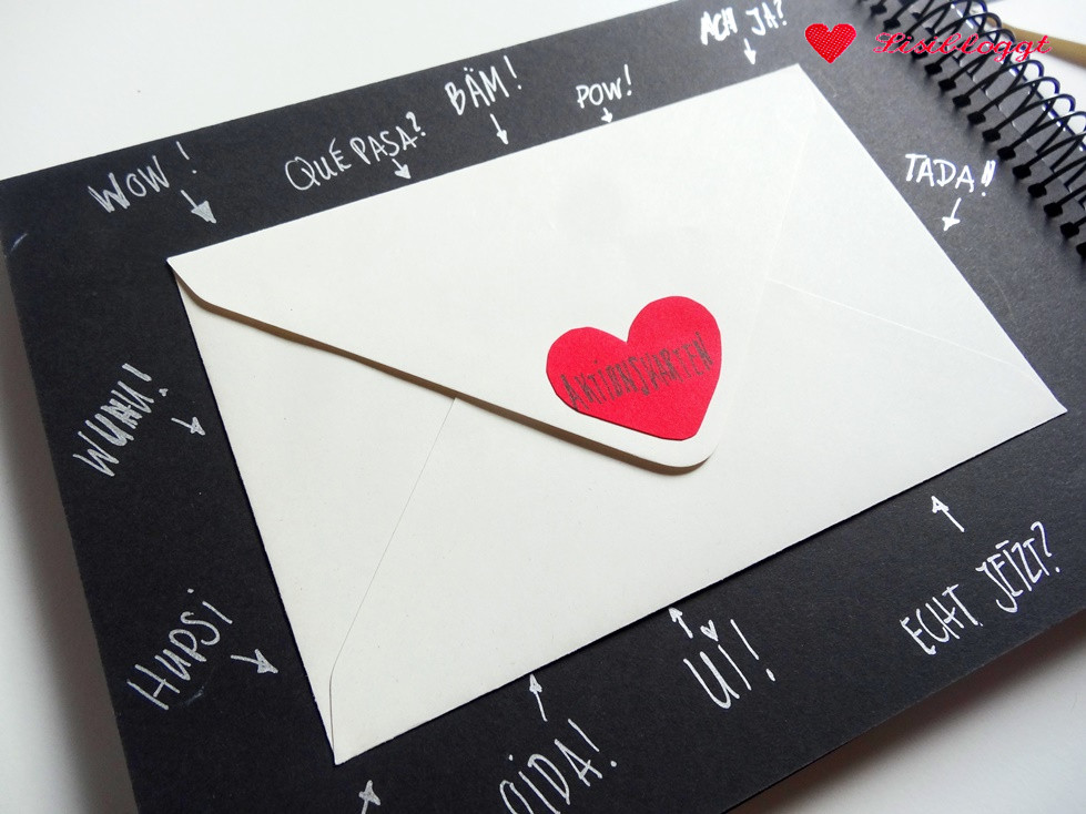 Das Album-Geschenk wird erst mal vorbereitet: Je nach dem, was es für ein Erlebnis sein soll, beschriftest Du das Album-Cover und lässt in der Mitte Platz für ein schönes Bild.