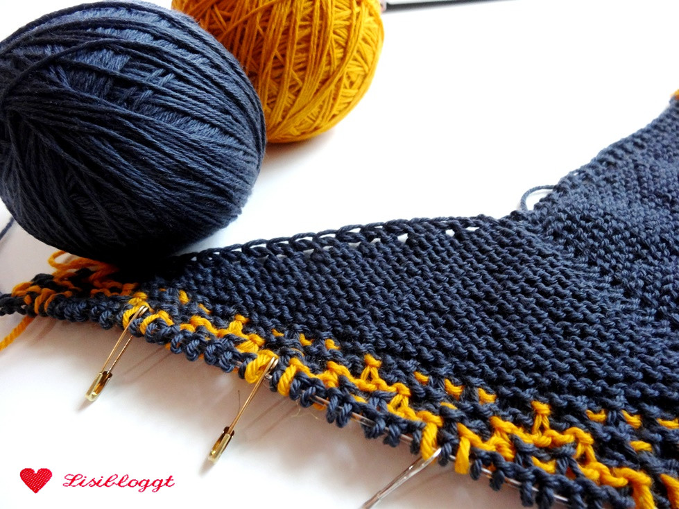 Was ich beim Tuch so praktisch fand: In den Hinreihen musste ich mir zwar den Rapport aus zu strickenden und abzuhebenden Maschen merken und nach der Anleitung stricken. In den Rückreihen wird dann aber alles so gestrickt, wie es auf der Nadel liegt – Maschen in der Farbe, mit der man gerade arbeitet, werden rechts gestrickt, die Maschen der anderen Farbe einfach abgehoben mit vorgelegtem Arbeitsfaden.