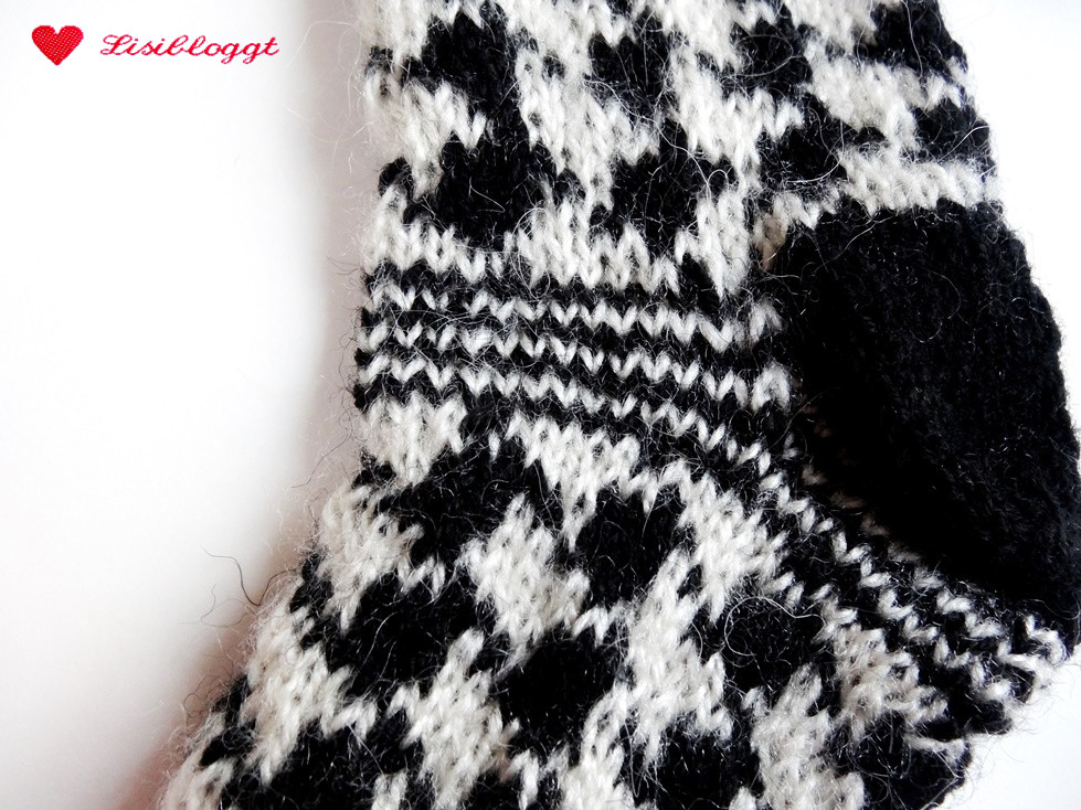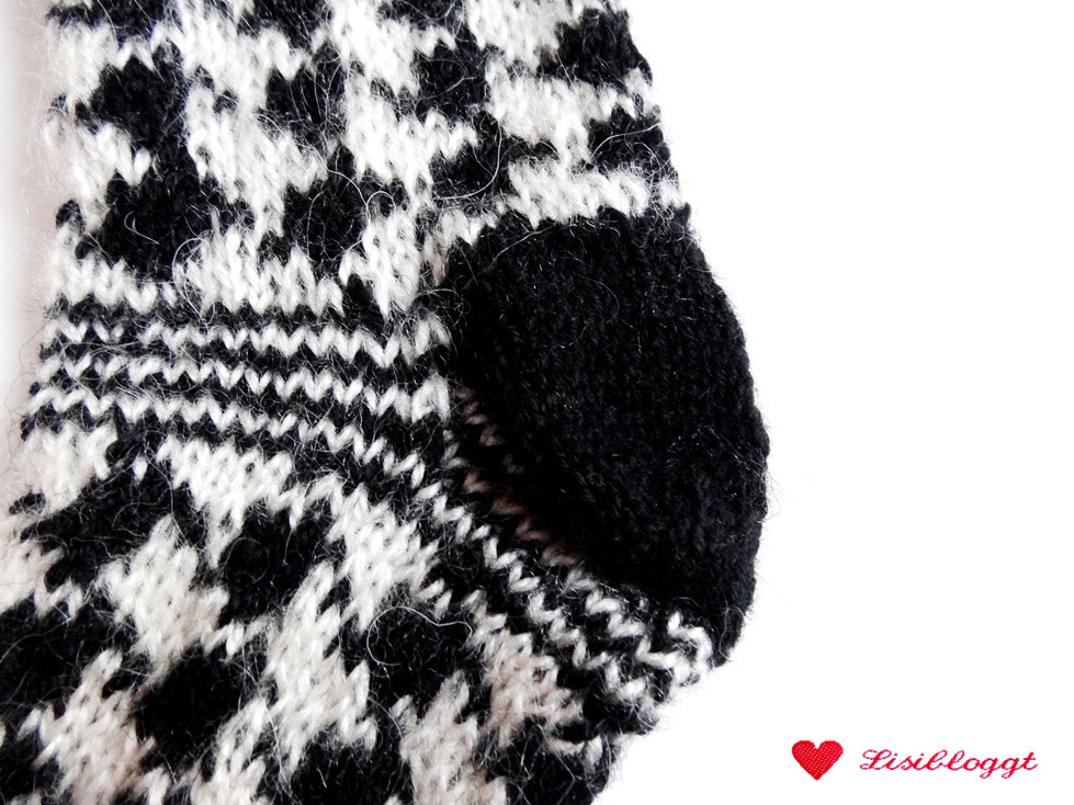 Wenn Du wieder mit dem Musterteil durch bist, kommt nur noch die Spitze an den Socken. Hierfür nimmst Du wieder nur das schwarze Garn und strickst damit wie gehabt in Runden, wobei Du auf jeder Nadel und in jeder Runde die beiden vorletzten Maschen rechts zusammenstrickst.