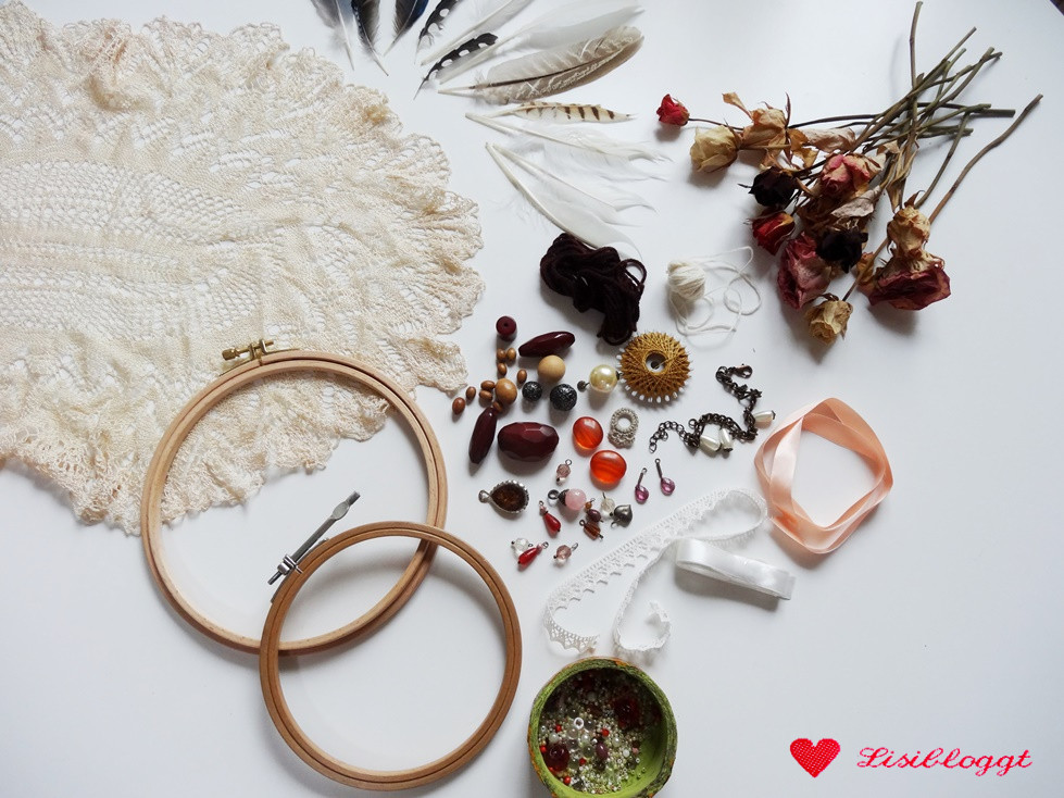 Ich hatte auch mit dem Gedanken gespielt, getrocknete Rosen zu verwenden – aber dann hat es beim ersten Traumfänger nicht richtig gewirkt. Beim zweiten (etwas kleineren) Modell hat es dann aber sehr schön ausgesehen (die Bilder findest Du weiter unten).