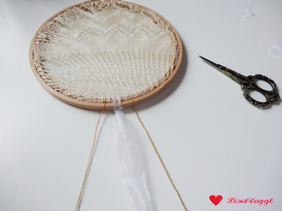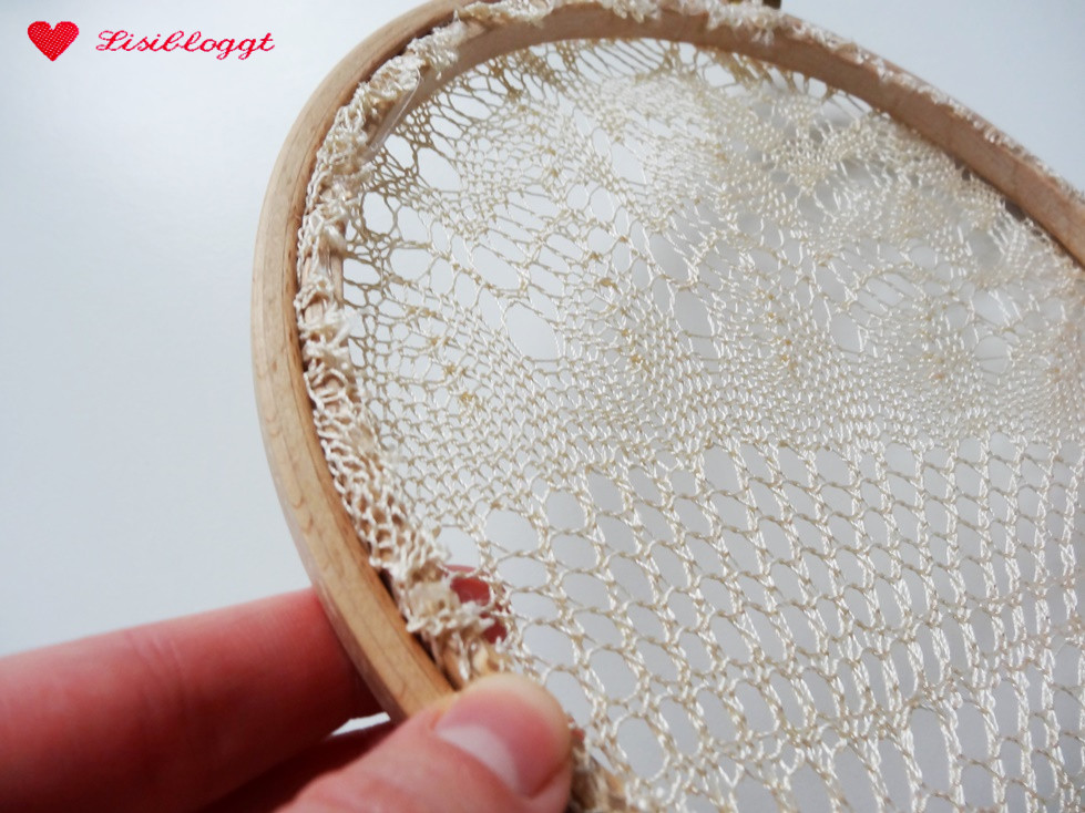 Lisitipp: Wenn Du keine Spitzendecke zur Hand hast, kannst Du auch einen ganz regulären Traumfänger knüpfen mit einem Faden. Wie sowas geht, zeige ich Dir in meiner älteren Anleitung zum romantischen Traumfänger mit Perlen.