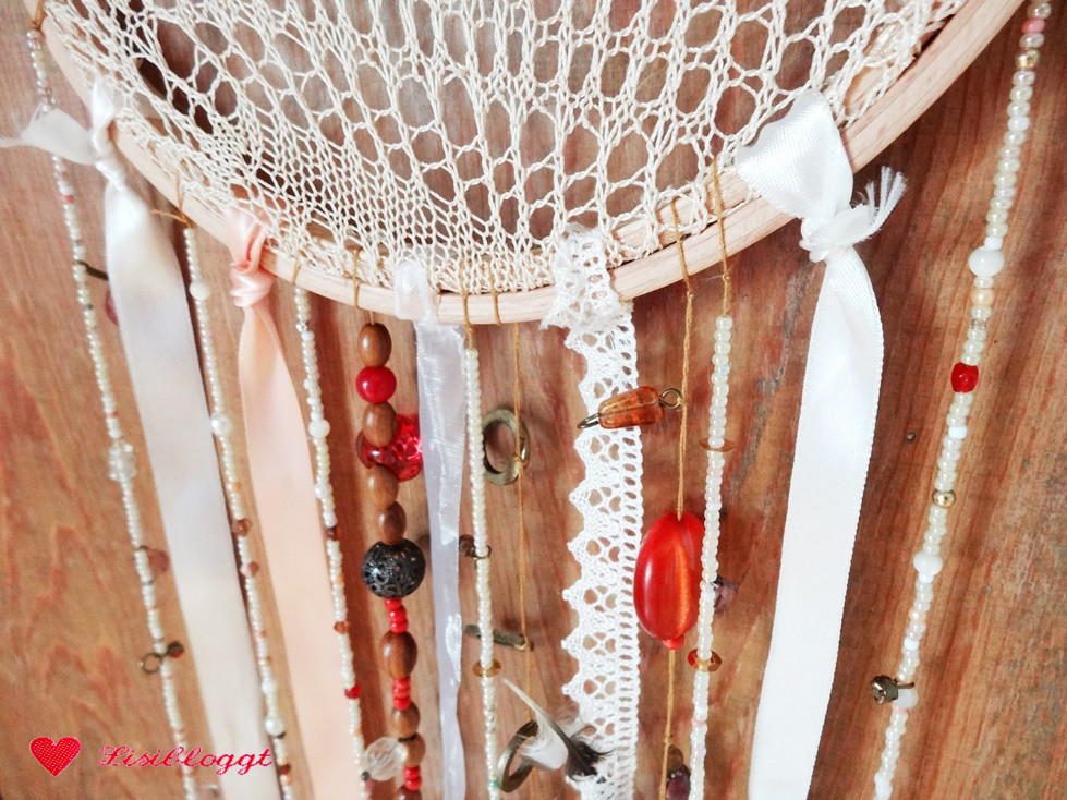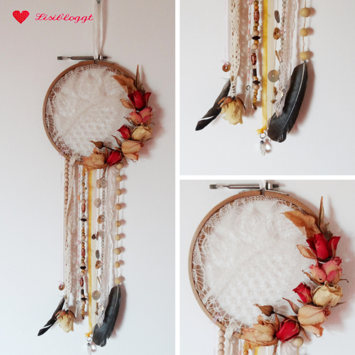 Mein zweiter Traumfänger mit Spitze hat noch ein paar getrocknete Rosenblüten als Deko bekommen – den werde ich an die Tür unseres alten Bauernschranks im Schlafzimmer hängen. Schließlich soll er ja die bösen Träume fangen, also muss er auch im Schlafzimmer hängen.