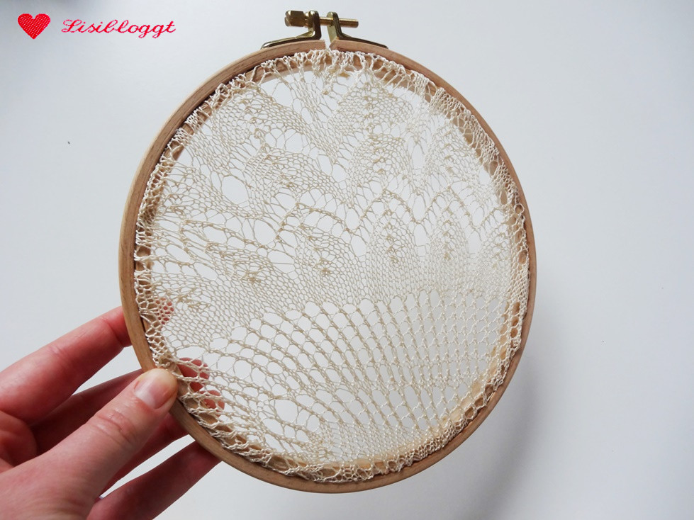 Wie ihr auf den Bildern sehen könnt, macht sich so ein Spitzen-Traumfänger vor einer hellen Wand zwar gut, was die Schnüre unten angeht. Aber der Spitzen-Teil oben geht etwas unter.