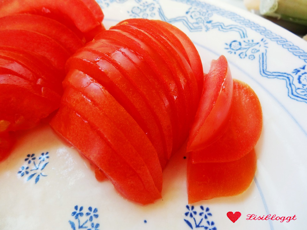 Die Tomate halbierst Du, schneidest den Strunk-Ansatz oben raus und schneidest die Tomatenhälften wiederum in dünne Scheiben.