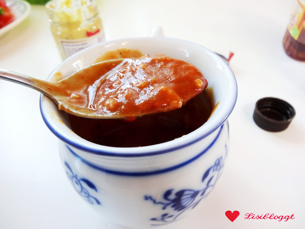 Es sollte von der Konsistenz her eine cremige Sauce ergeben, die sich noch gut verstreichen lässt, aber nicht allzu flüssig ist.