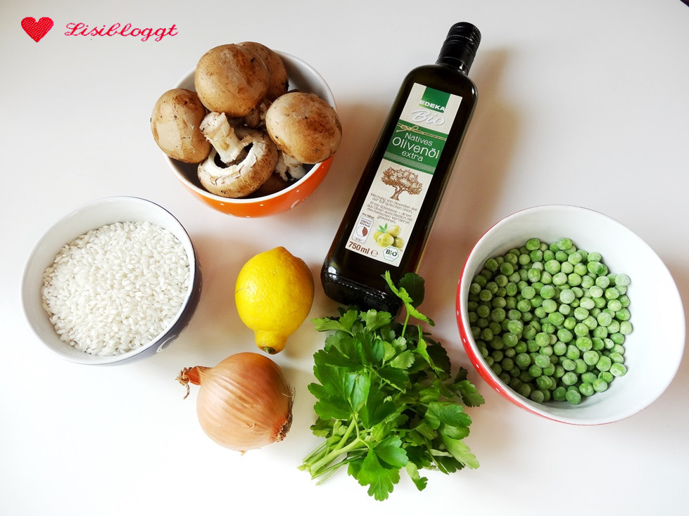 Ein feines Risotto geht eigentlich immer – es ist ein richtiges Wohlfühl-Gericht. Eigentlich ist es nicht aufwändiger, als Reis zu kochen und man kann es sehr vielseitig (je nach Jahreszeit und Geschmack) abwandeln. Meine Basis-Variante wird mit Champignons und Erbsen zubereitet, und zum Darüberträufeln gibt es ein frisches Zitronen-Öl.