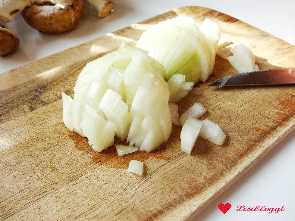 Zuerst wird alles klein geschnibbelt: Die Zwiebeln in kleine Würfel…