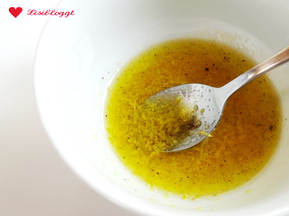 Anschließend verrührst Du die Zitronenschale mit 3-4 EL Olivenöl und würzt das Ganze mit Salz und Pfeffer.