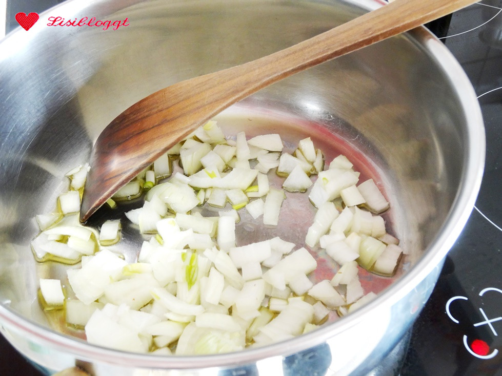 Dann gibst Du etwas Olivenöl in einen Topf uns brätst die Zwiebeln glasig an.