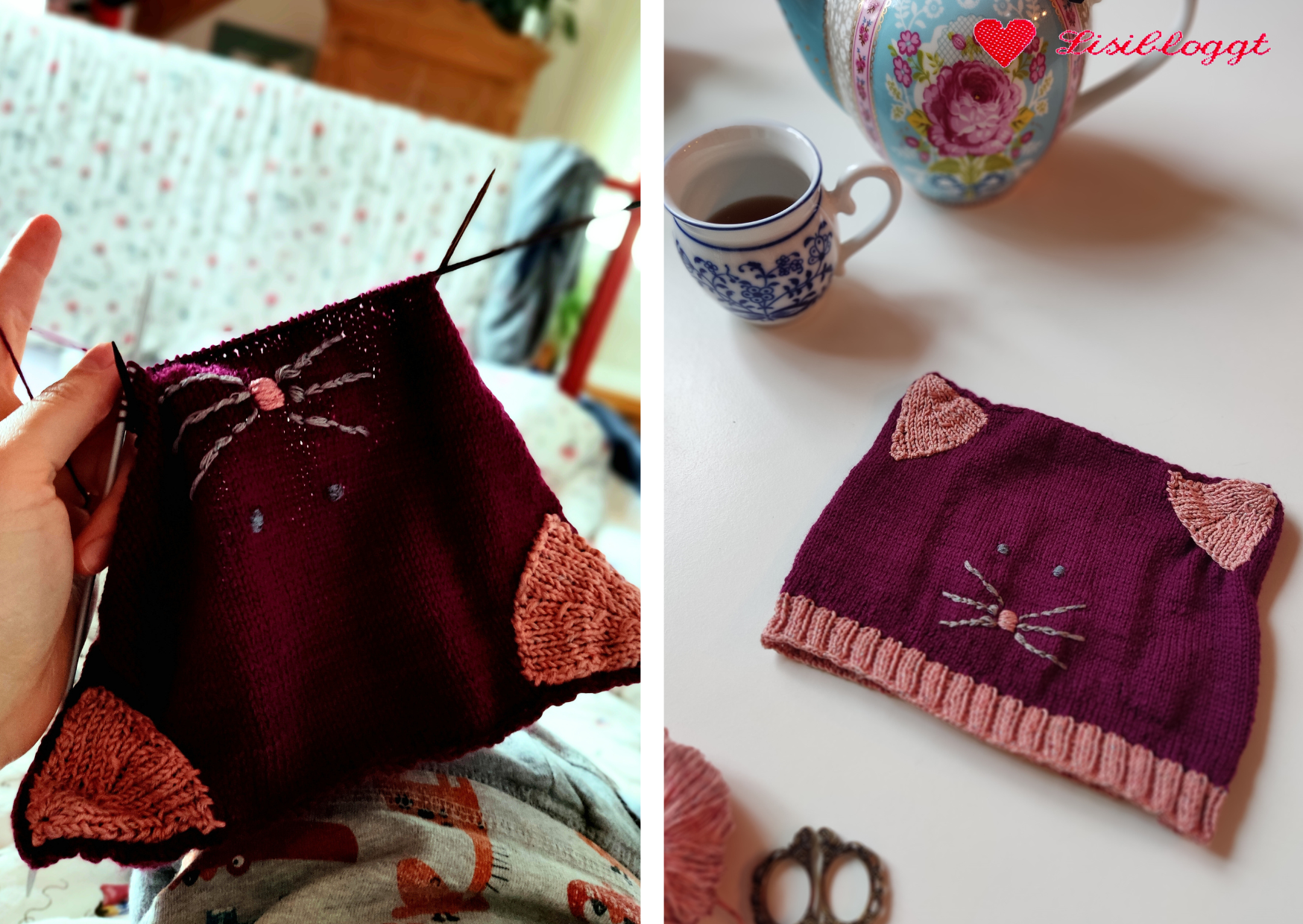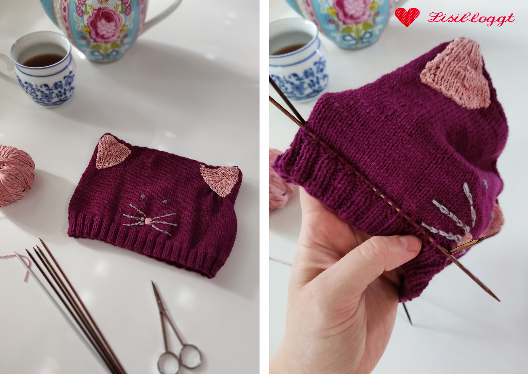 Die Ohren werden dann in die beiden oberen Ecken der Mütze genäht. Für das Katzengesicht stickst Du in der unteren Hälfte eine kleine Stupsnase auf, zwei Augen und natürlich dürfen Schnurrhaare nicht fehlen.