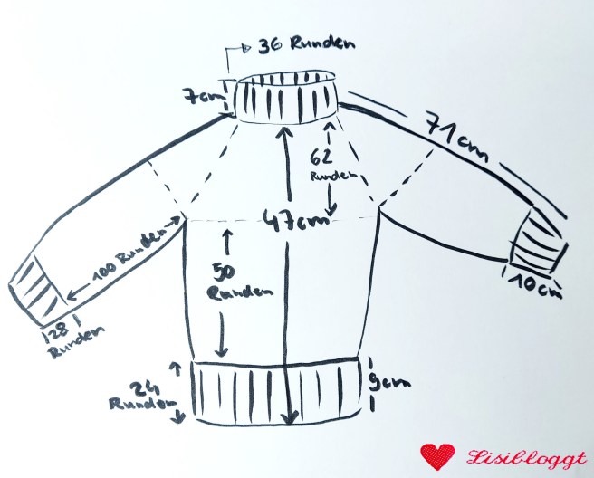Hier habe ich noch eine Schema-Zeichnung zum Pullover angefertigt – so kann man sich das Ganze immer ein bisschen besser vorstellen.
