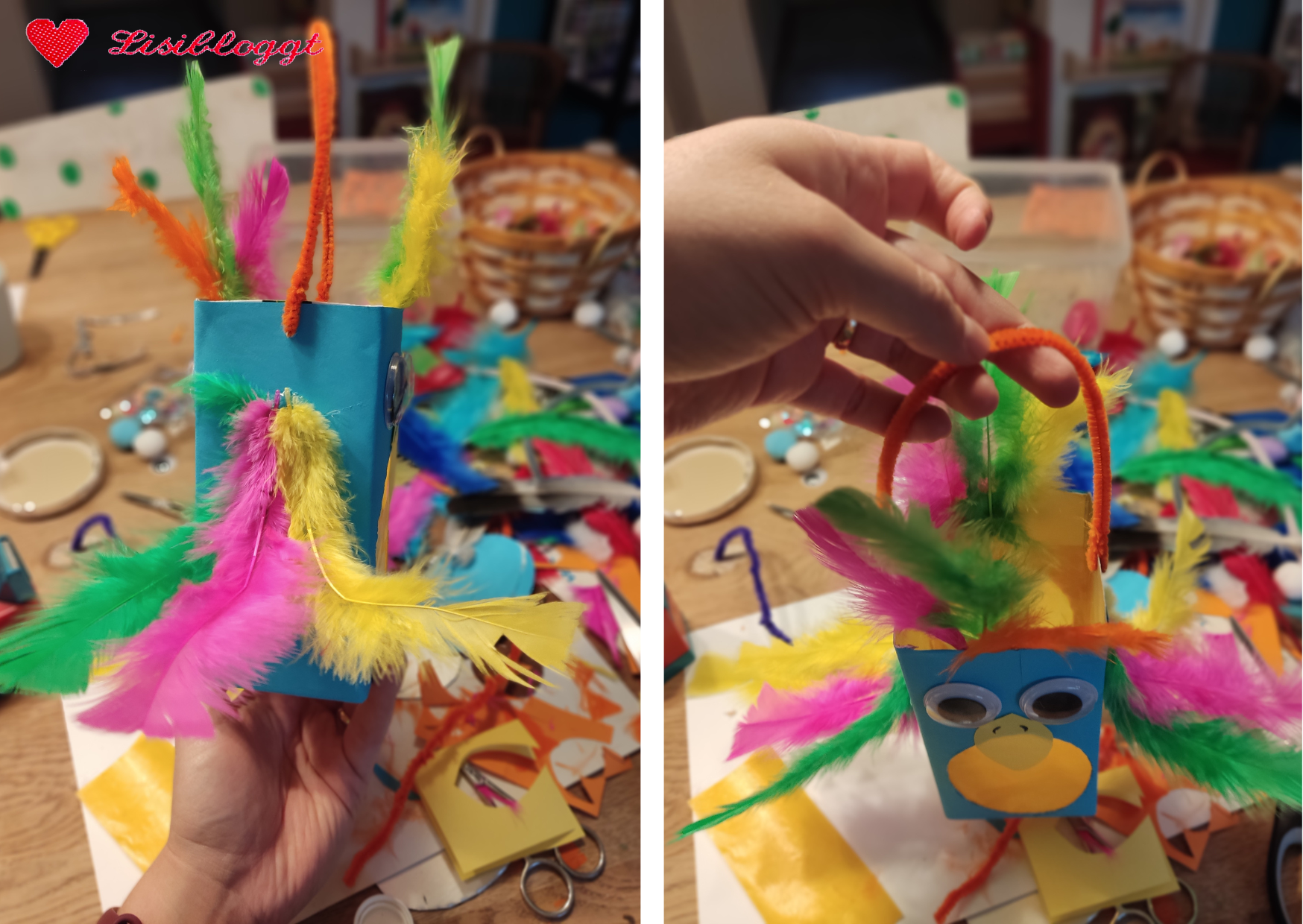 Die Auflistung der benötigten Dinge ist also nur theoretisch. Praktisch gesehen kannst Du sie komplett mit Tonpapier umsetzen. Ich persönlich war froh, Mal meine diversen bunten Federn zum Einsatz kommen zu lassen.